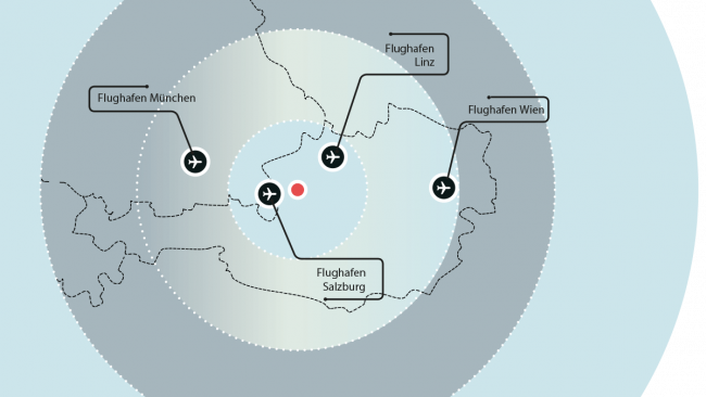 Salzburg liegt rund 35 Minuten, Linz etwa 50 Minuten und Wien rund zweieinhalb Stunden Fahrzeit entfernt. Über die A1 und weiter über die A8 ist auch München in ca. zweieinhalb Stunden bequem erreichbar.